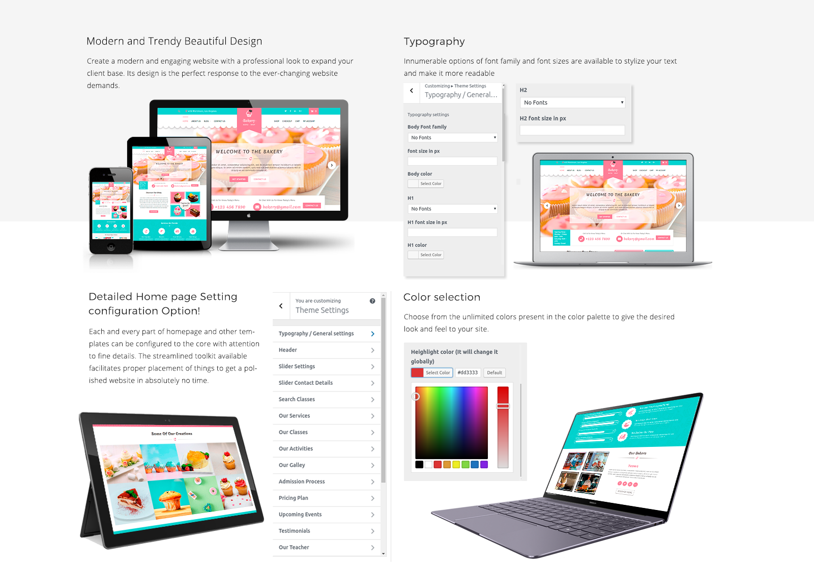 With the bakery WordPress theme, you can craft and establish a web page fast. You can fine-tune and brand the design in an easy manner. It is integrated with the current font awesome and also has section reordering. It has a beautiful design and the layout adapts to the screen. With the WordPress bakery template, there is no issue related to resizing and compatibility. It is compatible with contact form 7 and has stylish galley option and with the help of such galleries; the owners of the bakery website can upload pictures of tasty bakery products. It has advanced colour options and is translation ready