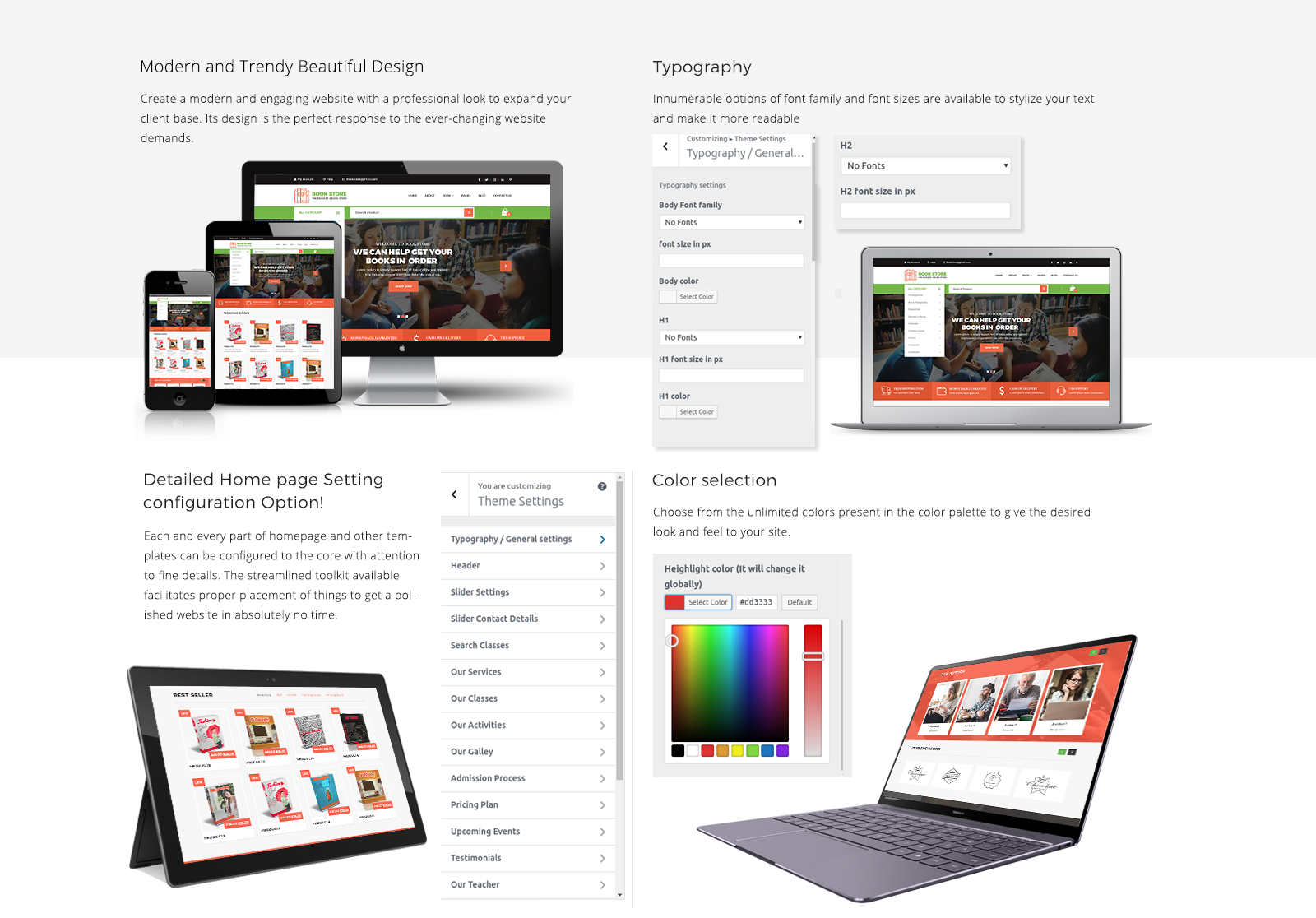 Bookstore WordPress template is an ideal template for designing top class and extremely professional websites for bookshops and libraries. It makes an engaging website that is intended to work beautifully on all the web browsers. This is possible because of its cross-browser compatibility. You get a bunch of exceptional features that lead to the creation of super attractive web pages. This WordPress template for bookstore is also effective in promoting reading rooms and online book shops as well. The fully customizable layout allows you to choose from hundreds of colors and font styles. It has a 100% responsive design that adjusts itself to screens of various devices. Section reordering feature is available just in case you want to shuffle the order of sections on the website. You can enable or disable any section. It varies from person to person.