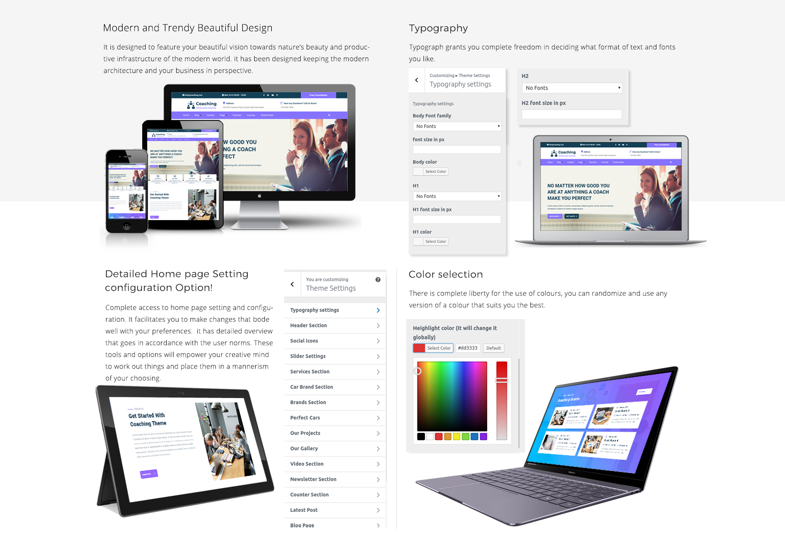 This coaching WordPress template offers several website layouts like boxed, full width and full screen. It also has a variety of header and footer formats so you can decide the position of the navigation bar, logo and other elements you want to include in the header. It is a heavily customizable theme whose colour, background, font, menu style, slider settings and logo can be changed to represent your brand. All the changes can be done through theme customizer which allows easy customization in just a few clicks without involving in the coding part. It loads on all browsers and can be translated into any of the various languages it supports. This coaching WP theme is rich in shortcodes, so you can implement functionality like multi-column layout, video and audio posts, instagram feeds etc. in just a single line. It is packed with Font Awesome icons to enhance the site’s look. With this coaching theme comes premium membership wherein you will get customer support for all your theme code related problems and regular theme updates for one year. As colours play a vital role in giving the best professional look, it provides unlimited colours so you have many options.