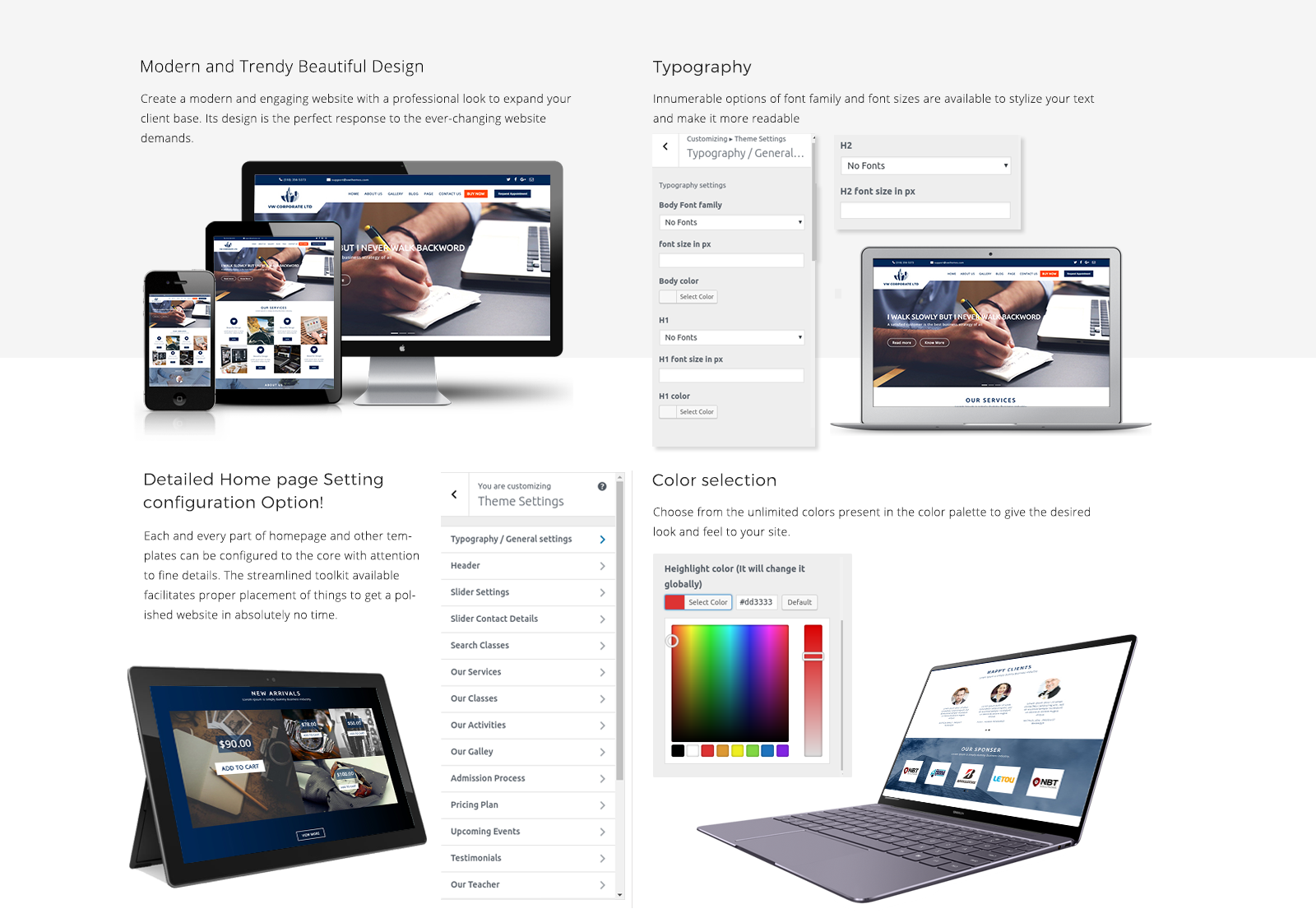 Choose your own custom fonts for headings, titles, and text from an extensive font library.