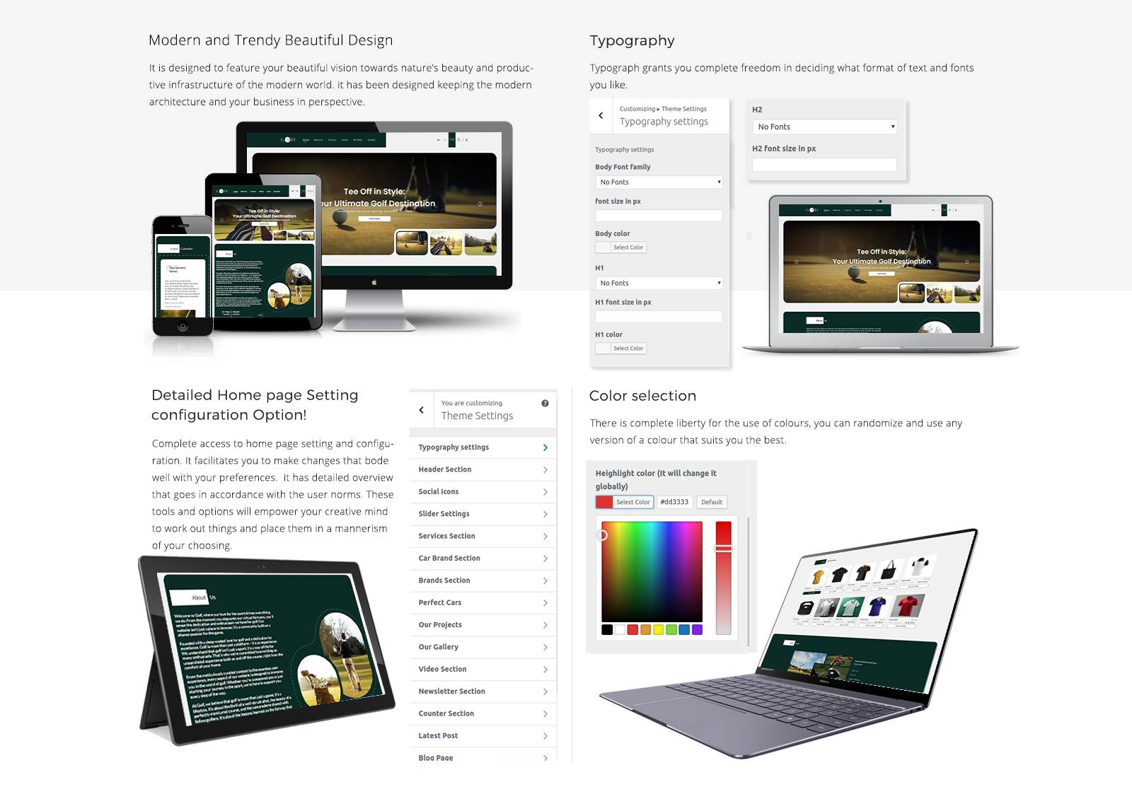 The Golf Coast WordPress Theme represents a pinnacle in design and functionality for golf courses and related businesses seeking to elevate their online presence. As a premium theme, it combines aesthetic appeal with advanced features to provide a comprehensive solution for creating stunning and user-friendly websites. The theme boasts a clean, modern design that is visually appealing and ensures a seamless user experience across all devices. Its responsive layout adapts effortlessly to desktops, tablets, and smartphones, ensuring your website looks beautiful and functions perfectly regardless of the screen size.