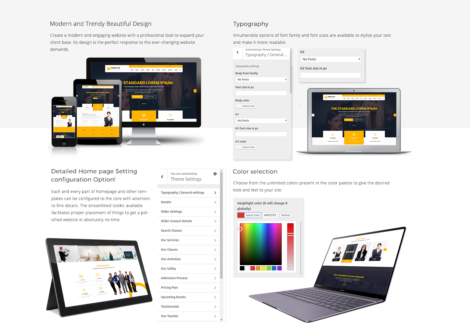 Choose your own custom fonts for headings, titles, and text from an extensive font library.