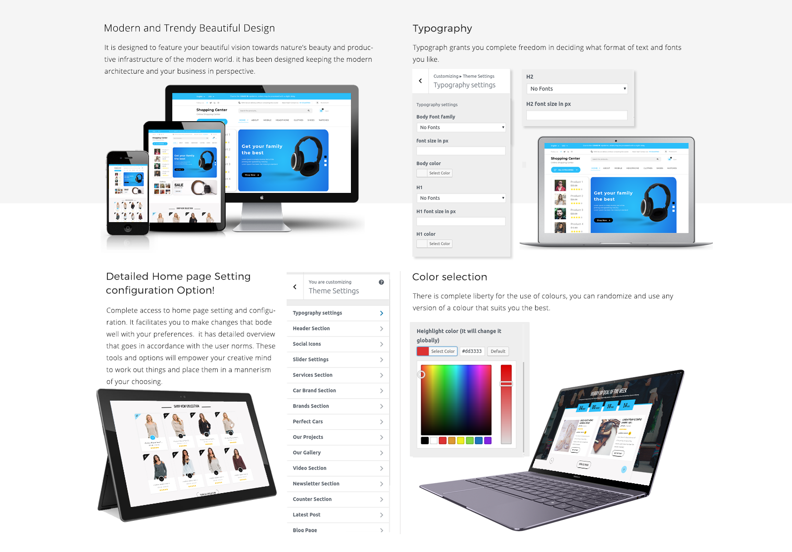 Quickly change aspects of the design with a built-in customizer.