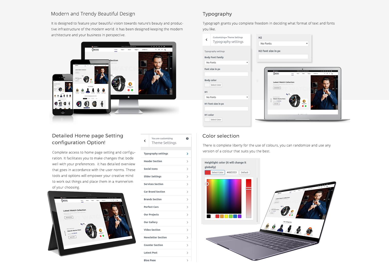 The Watch Store WordPress Theme is a premium solution tailored for watch retailers looking to enhance their online presence and boost sales. This theme is designed with the modern consumer in mind, combining aesthetic appeal with robust functionality. It boasts a fully responsive design, ensuring that your store looks fantastic on any device, whether it's a smartphone, tablet, or desktop. With a user-friendly interface, customers can effortlessly browse through your collection of watches, complete with high-quality images and detailed descriptions. The theme supports multiple post formats, allowing you to share valuable content about watch care, styling tips, and industry news, helping to engage and educate your audience while enhancing your SEO strategy.
